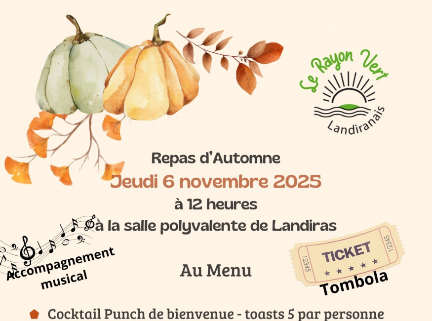 A 12 heures, venons partager un repas à la salle polyvalente de Landiras. Au menu : Comme d’habitude le repas se déroule en musique et une tombola est organisée....