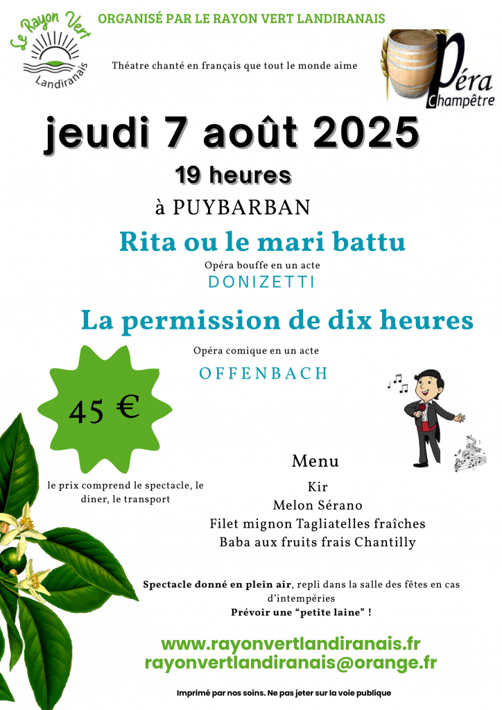 Sur réservation auprès de Sylviane Fauthous : 07 87 96 38 20 ou par mail rayonvertlandiranais@orange.fr